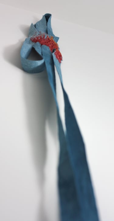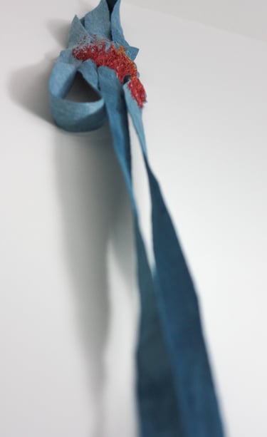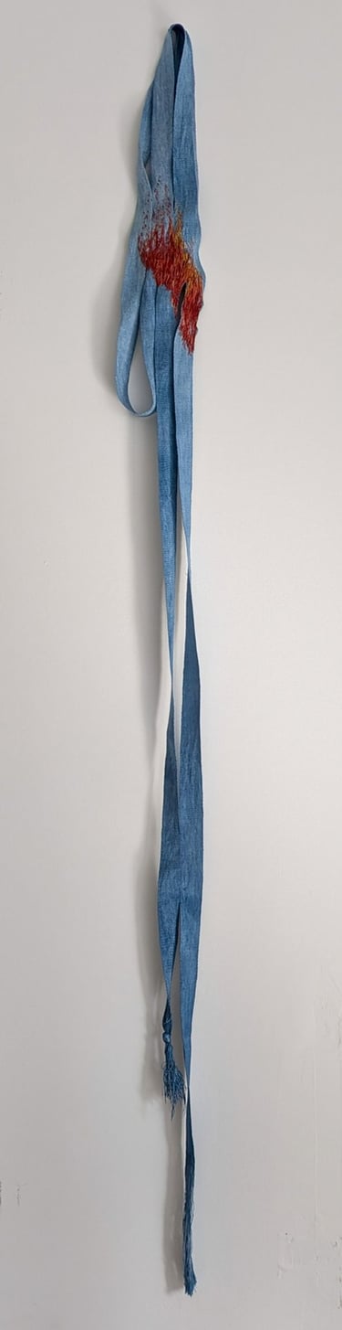 Tissage artisanal des textiles et rubans en lin, teintures végétales. Toison de brebis, sculpture textile et techniques diverses de vieillissement des matières. Broderie d'écailles de pommes de pin.