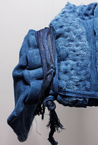Tissage artisanal des textiles, teintures végétales. Toison de brebis, sculpture textile et techniques diverses de vieillissement des matières. Perles.