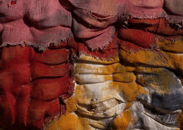 Lin, soie, perles, fil d'or véritable, toison de brebis, tissage artisanal des textiles, teintures végétales (racine de garance, indigo, réséda), couture, broderie, béton, usure à la pierre.